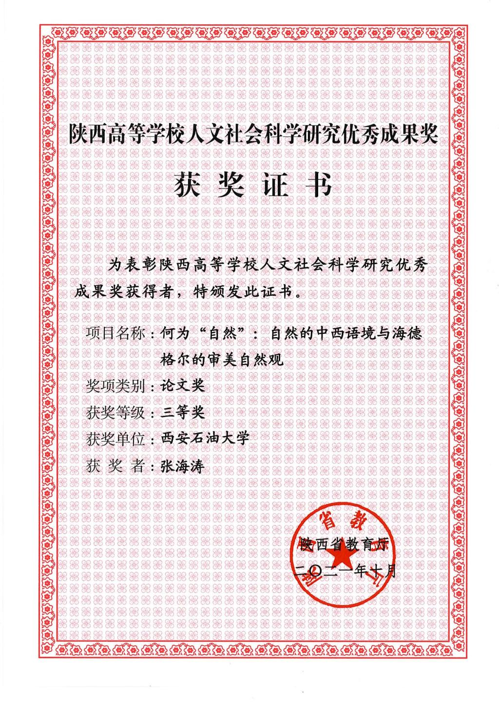 2021年陕西高等学校人文社会科学研究优秀成果三等奖(张海涛)